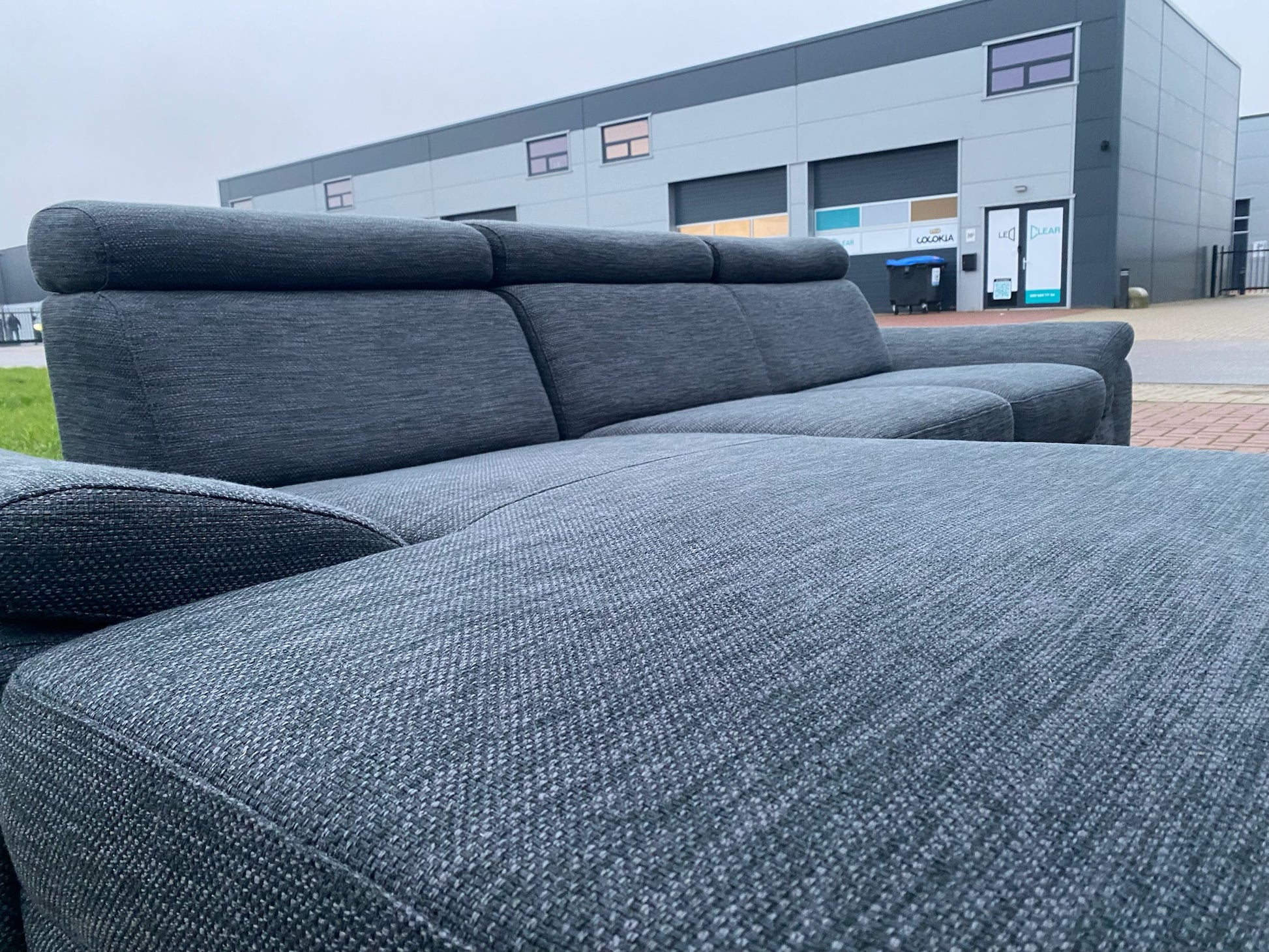 More about this Beautiful Montel Grey Fabric Corner sofa + Stool: