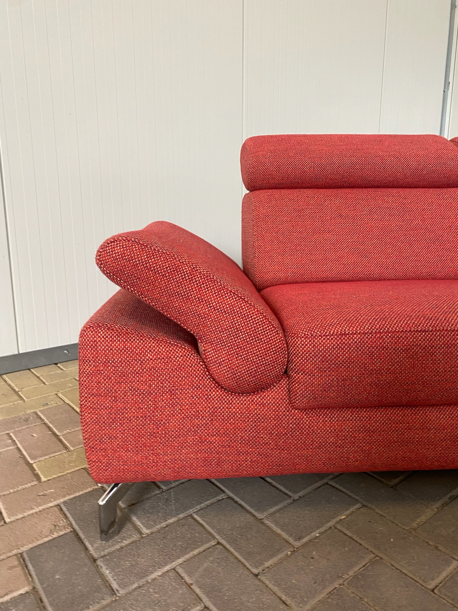 Deze moderne en ruime rode stoffen hoekbank combineert comfort, stijl en functionaliteit. Perfect voor loungen, relaxen of gezellige avonden thuis! Dankzij de verstelbare hoofdsteunen en het open hoekgedeelte is deze bank zowel praktisch als uitnodigend.