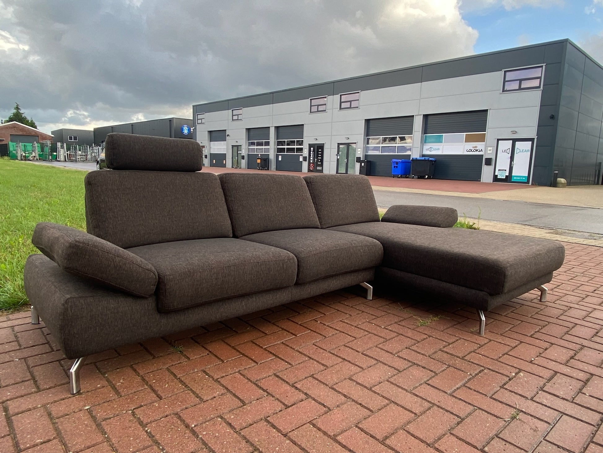 Upgrade your living room with this elegant Henders & Hazel corner sofa in a rich dark brown tone. It features an adjustable armrest, supportive headrest, and wide seating for relaxing in style.
