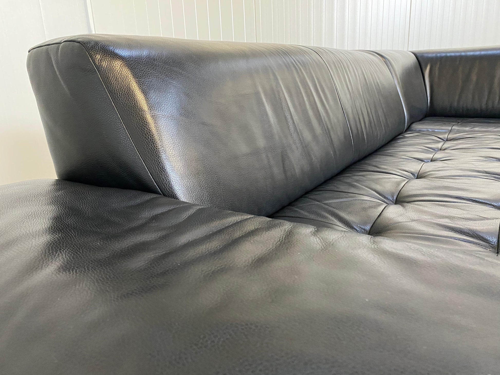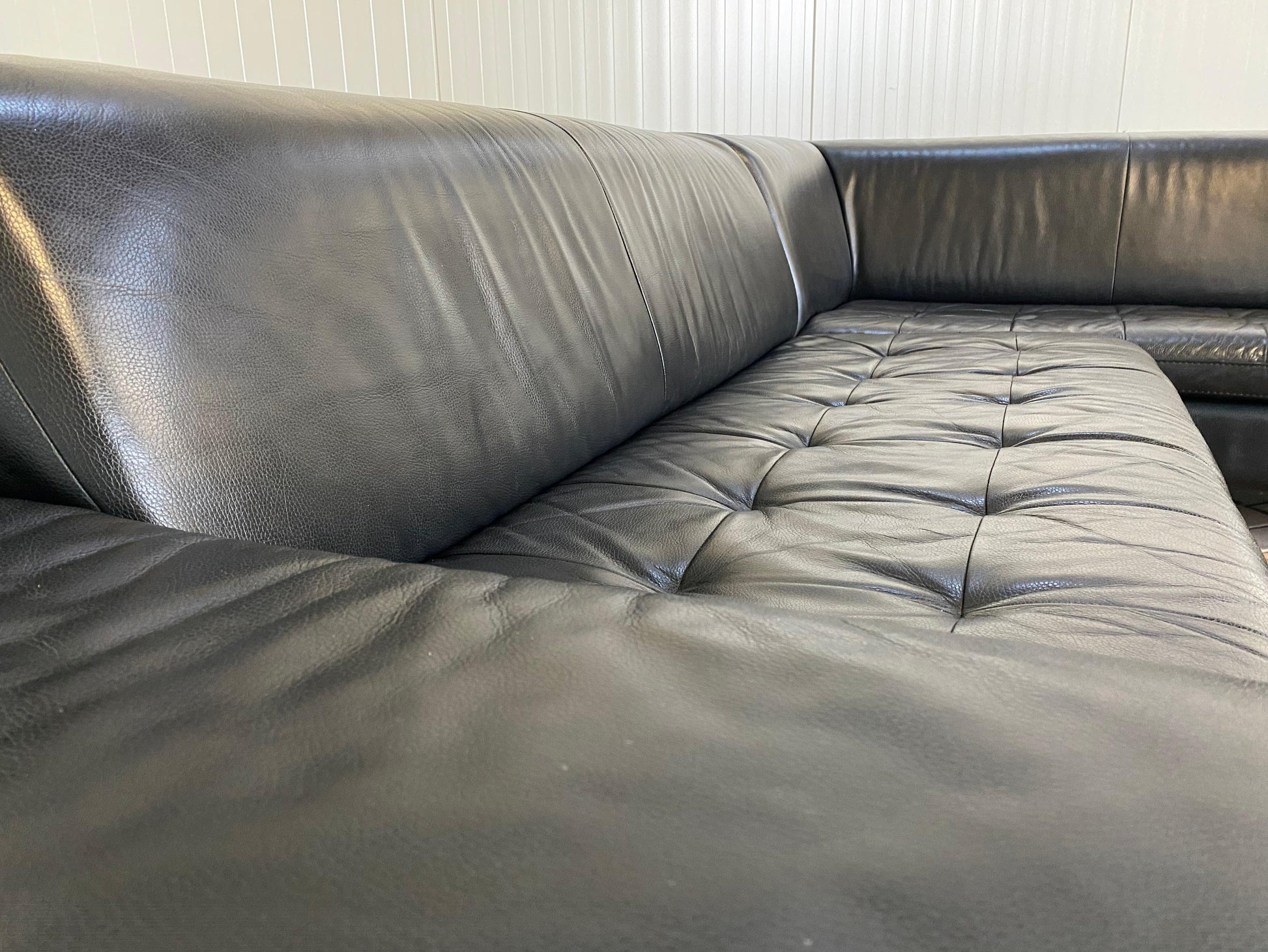 Deze zwarte lederen hoekbank combineert luxe en comfort met zijn ruime ontwerp en hoogwaardige materialen. Gemaakt van echt leer in gewatteerde stijl, moderne aanraking aan elke leefruimte. In geweldige staat biedt deze bank zachte lederen textuur en uitzonderlijke duurzaamheid.